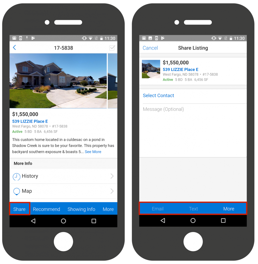 Conveniently share single listings, selected listings, or searches by using the blue ribbon at the bottom of the share screen.
