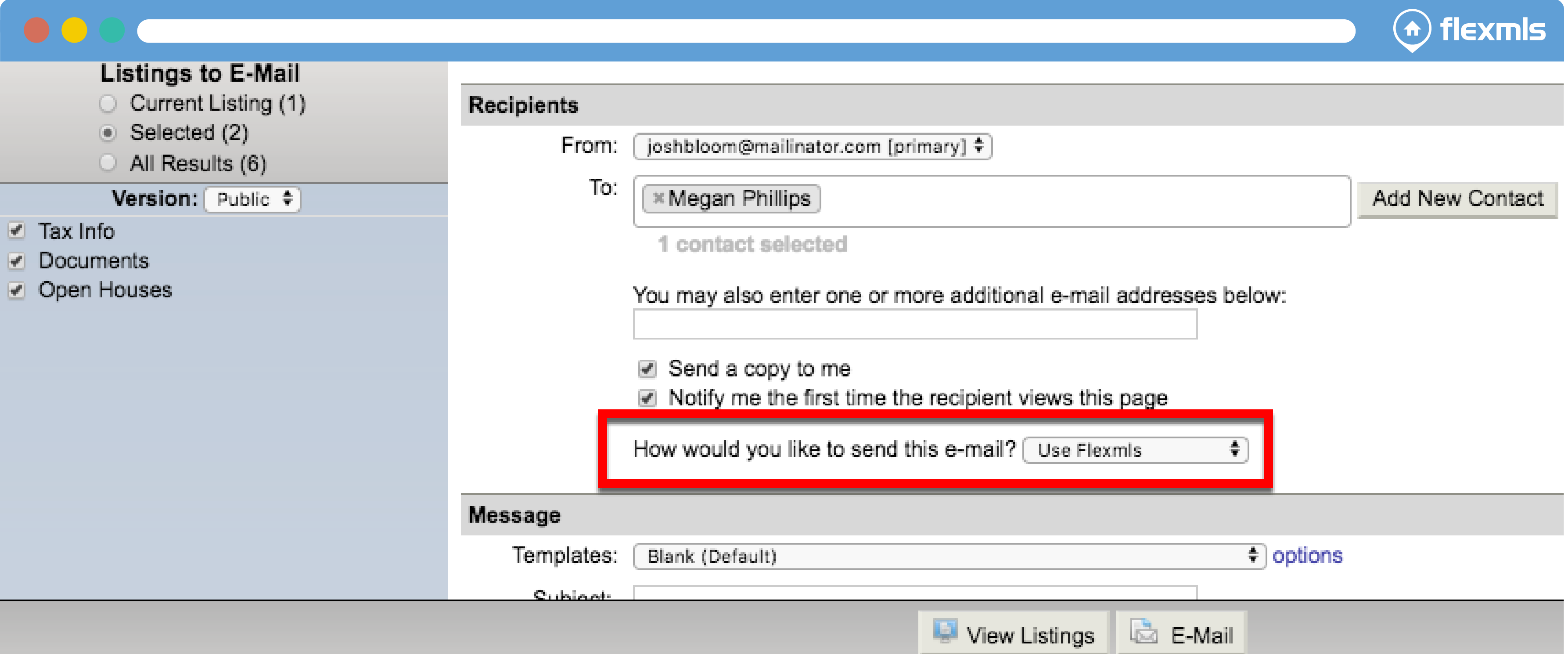- Use Flexmls Ð This option will e-mail the listings to the selected recipients via Flexmls. Replies to the e-mail will be sent to your primary e-mail address (as designated in Flexmls Web). With this option, you will always be able to view the recipient (and when the link was opened), when viewing My Sent E-Mails.