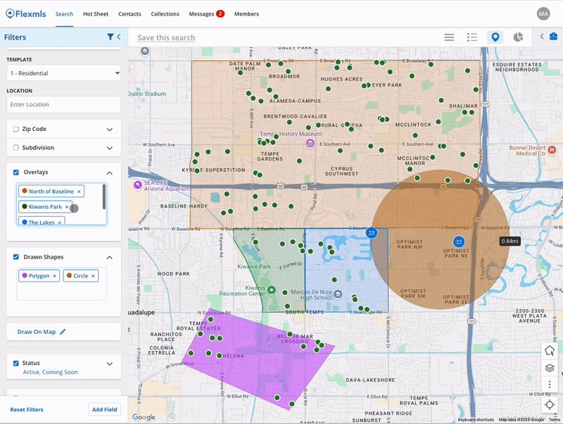 Previously available only as a visual experience, map overlays and drawn shapes can now be used as a search tool, allowing you to filter your search by saved overlays and drawn shapes. From the Filter panel, you can easily focus your search by adding a map overlay in the Location field or the Overlays field, in addition to drawing a new shape on the map.