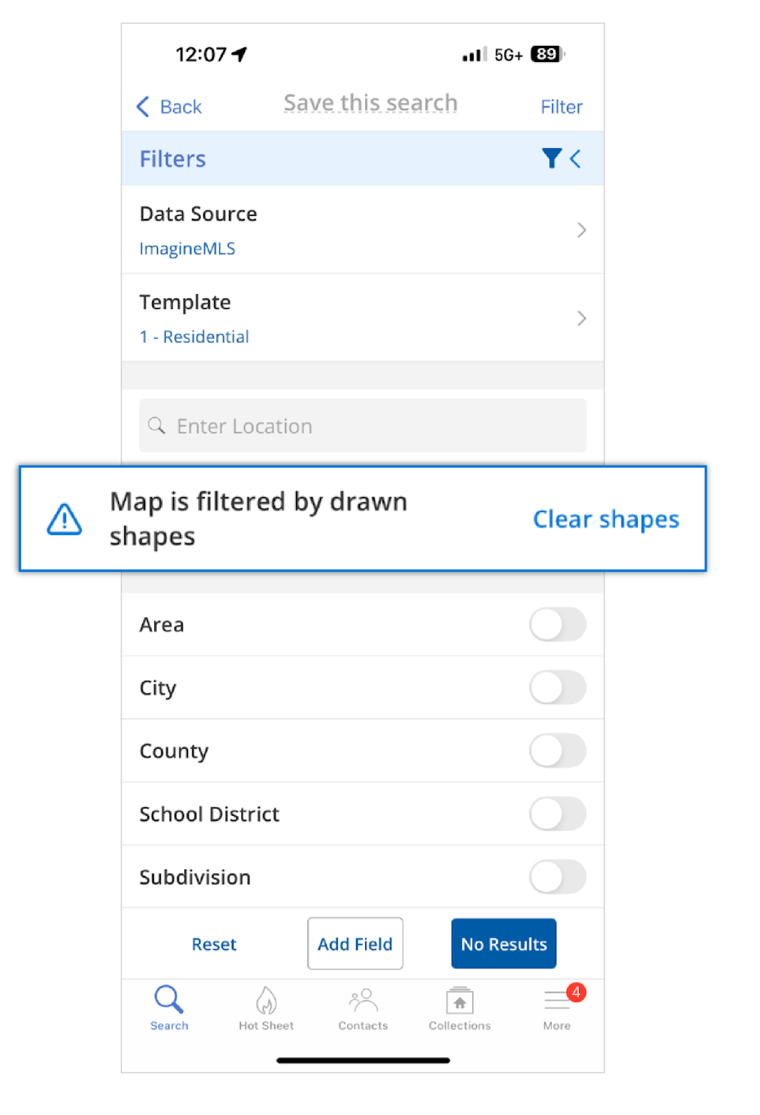 If you’ve drawn an overlay on the map, and you go back to filter your search, you will see a prompt telling you that your search is being filtered by drawn shapes. Here, you will have the option to clear those shapes and remove that criteria from your search.