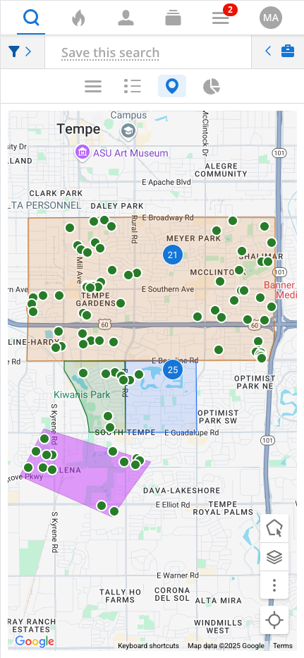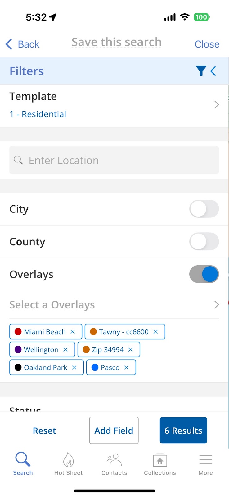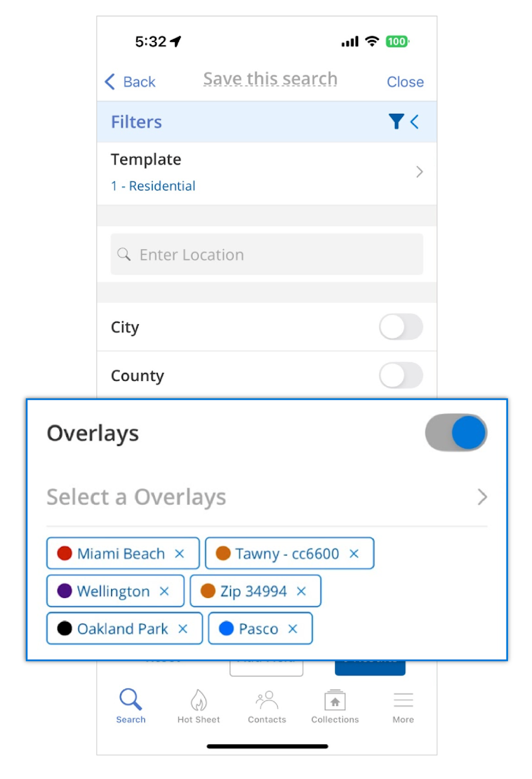 Overlays and drawn shapes are a quick and easy way to search a specific area on the map, and now you are able to use them as a filter when searching on a mobile device (iOS app, Android app, mobile web browser). From either the Location field or the Overlay field, you can access and use saved overlays or draw shapes on the map to create a more targeted search for your buyers.