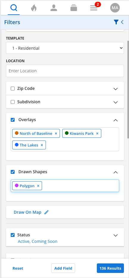 Clicking on each filter in the Overlays or Drawn Shapes field highlights the corresponding overlay on the map, making it quick and easy to identify and edit any of these search filters. To delete a filter, click the X next to the filter name. Filters in the Location or Overlays field are saved, and you can select them again after deleting them. However, if you delete a Drawn Shape filter, you will need to re-draw the shape if you want to recover that filter.