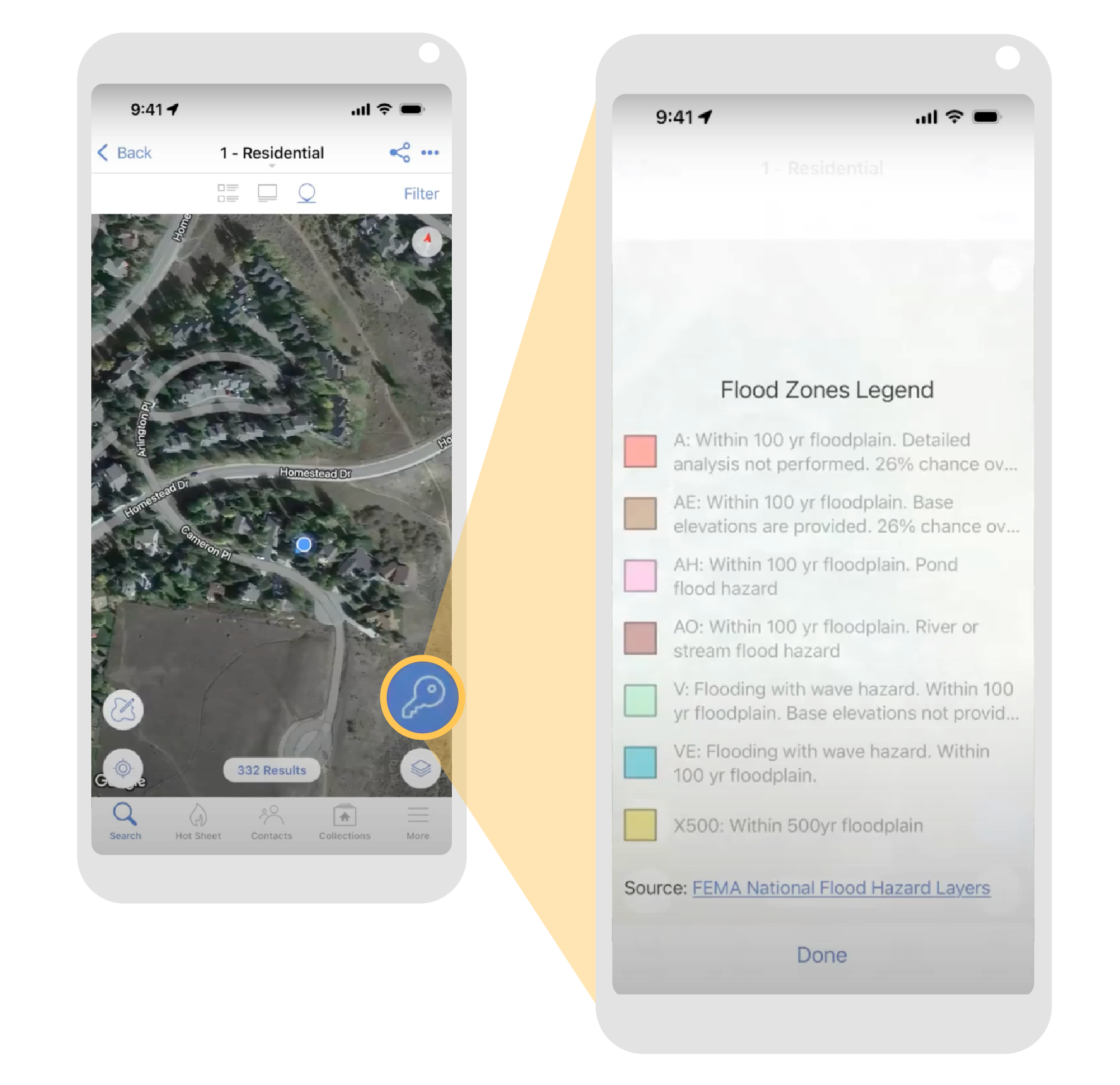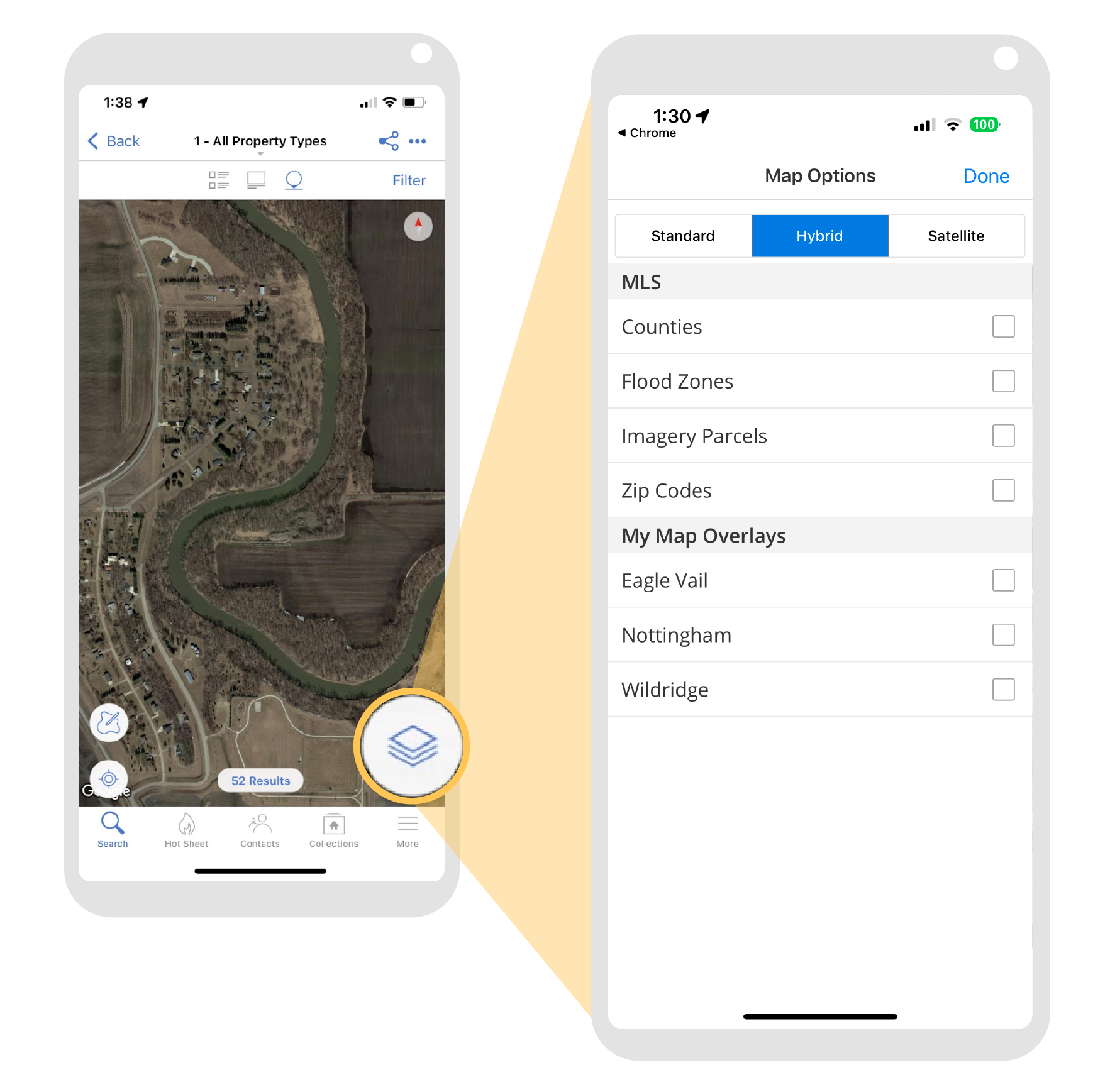 Previously, the Layers icon could be used to switch between the standard, hybrid, or satellite view. With this enhancement, the Layers icon can also be used to select from available MLS map overlays. Agents can also select their own map overlays.