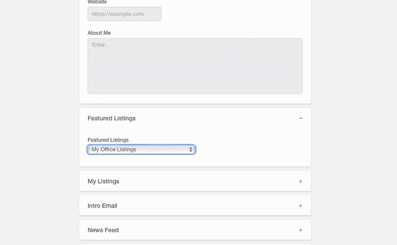 Under Featured Listings, you can choose to display your listings, your office listings, or listings from a saved search.