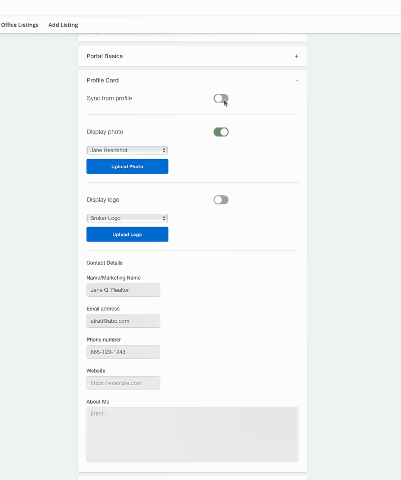 Under Profile Card, turn the toggle ON to sync your contact info from your current Flexmls profile. Turn the toggle OFF to create new contact details (separate from your Flexmls profile) to display on your portal, as allowed by your MLS.
