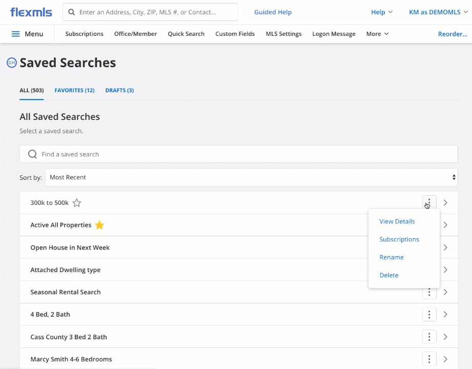 The More (three dots) menu will be displayed for each saved search. The More menu gives you one-click access to view saved search details, view related subscriptions, rename the saved search, or delete the saved search.