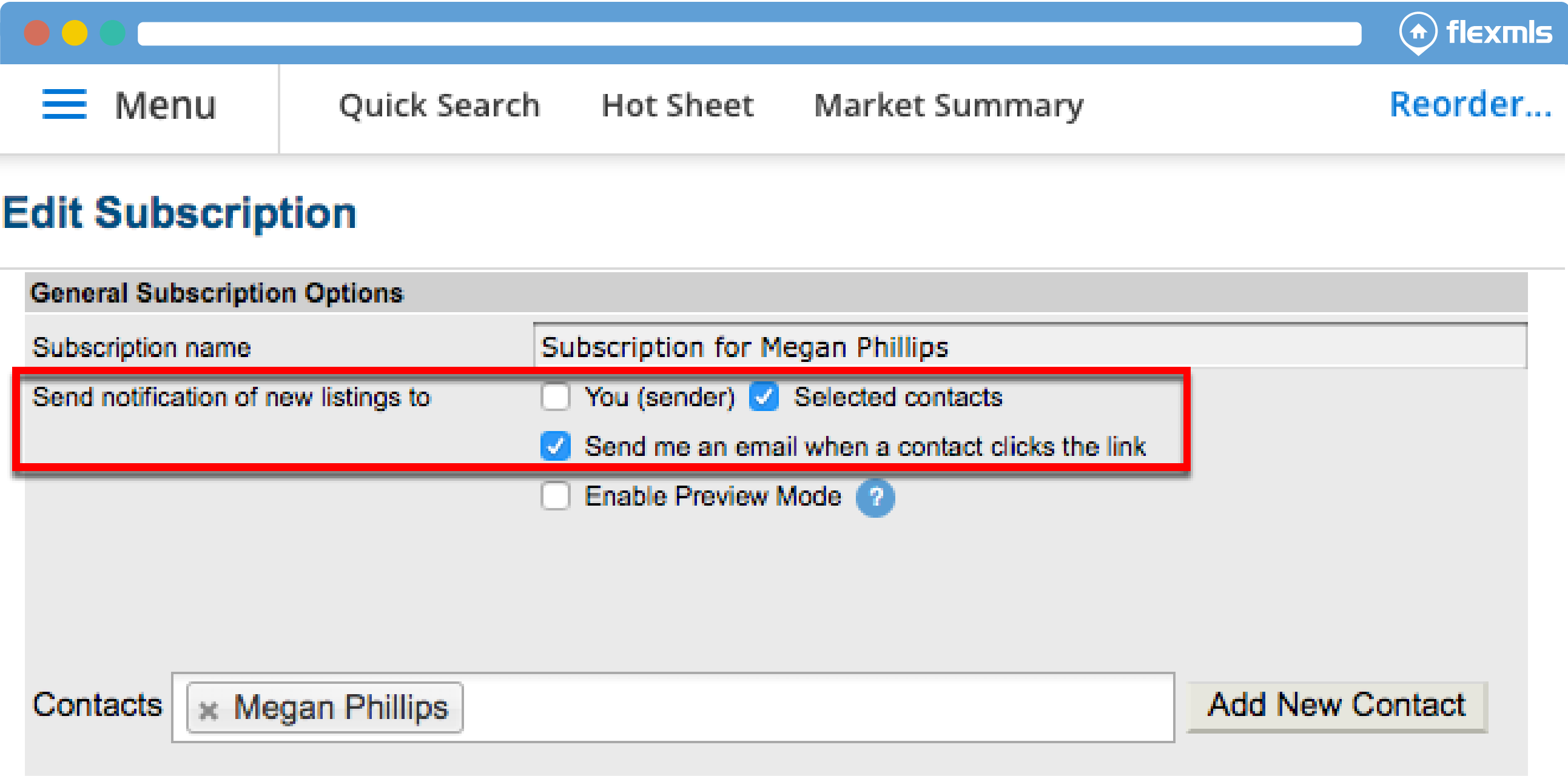 • Enable Preview Mode Ð You must approve listings before they are sent to your contact. Note: this option will always be unchecked by default. You must manually enable it on a per-subscription basis if you wish to turn it on. No notification options will be saved as defaults for new subscriptions when you use Preview Mode.