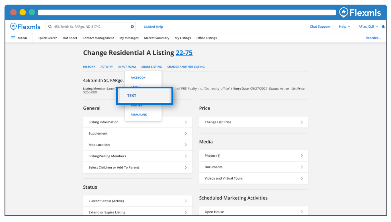 You will now be able to share single or multiple listing(s) from Flexmls Desktop to Homebuyers via text message. You can access this new text message feature from the Share button on the Quick Search and Change Listing page.
