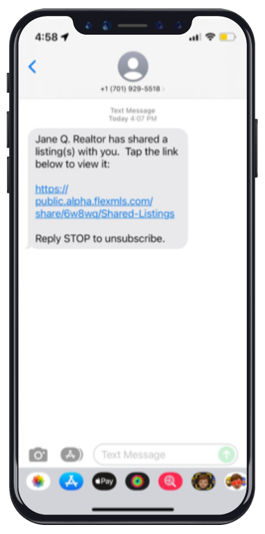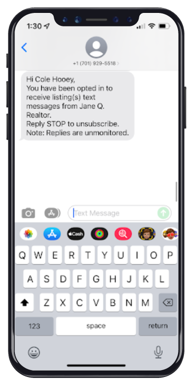 Once your client has opted in to receive text messages, they will be able to receive links to listing(s) that you share, as well as a notice that replies are unmonitored. From there, they can open the link and view the listing(s) on their phone.
