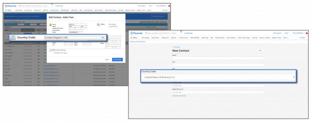 For international phone numbers, there is an additional dropdown to select your contact’s country code when entering their phone number under Contact Management, or when adding a new contact during the Share via Text process.