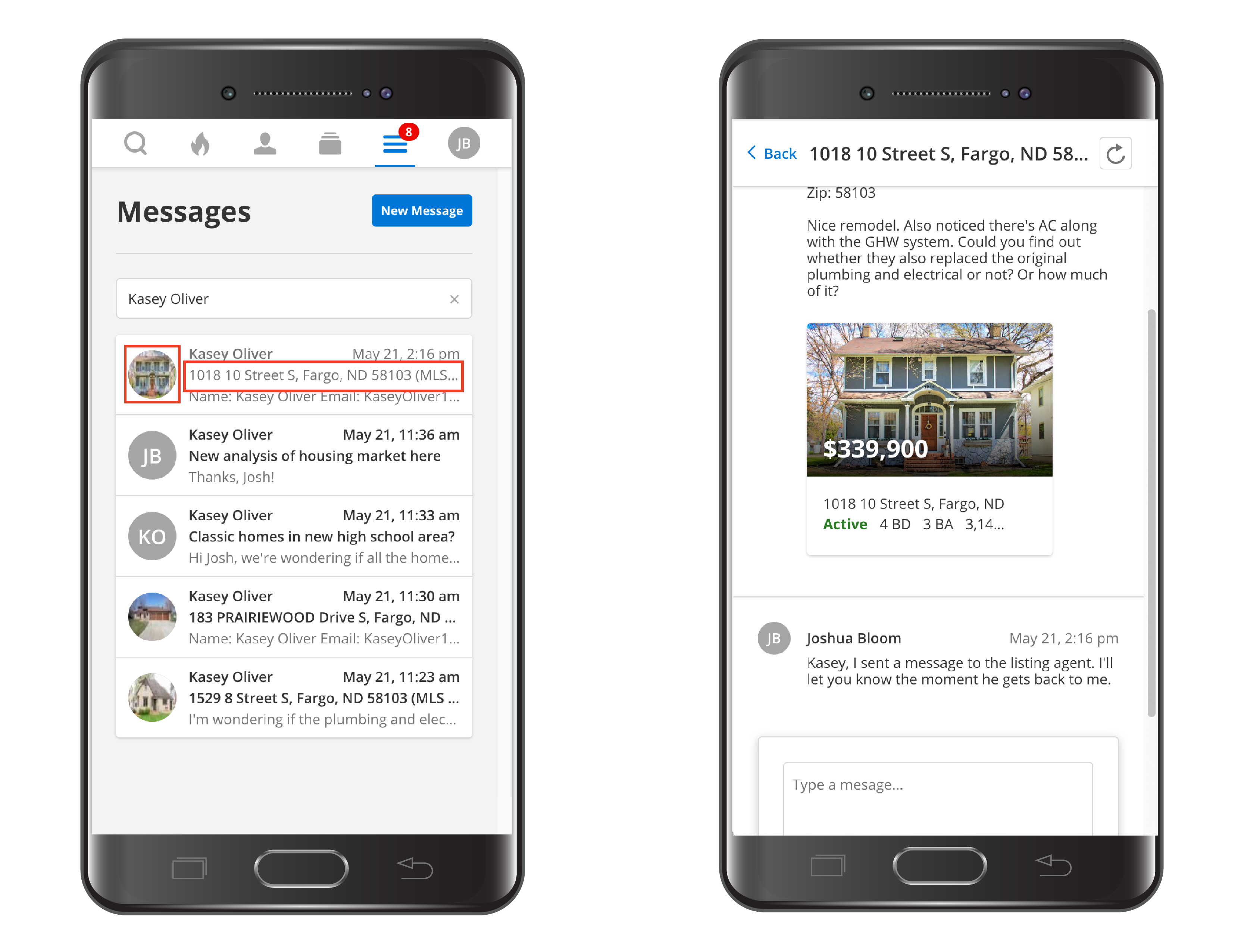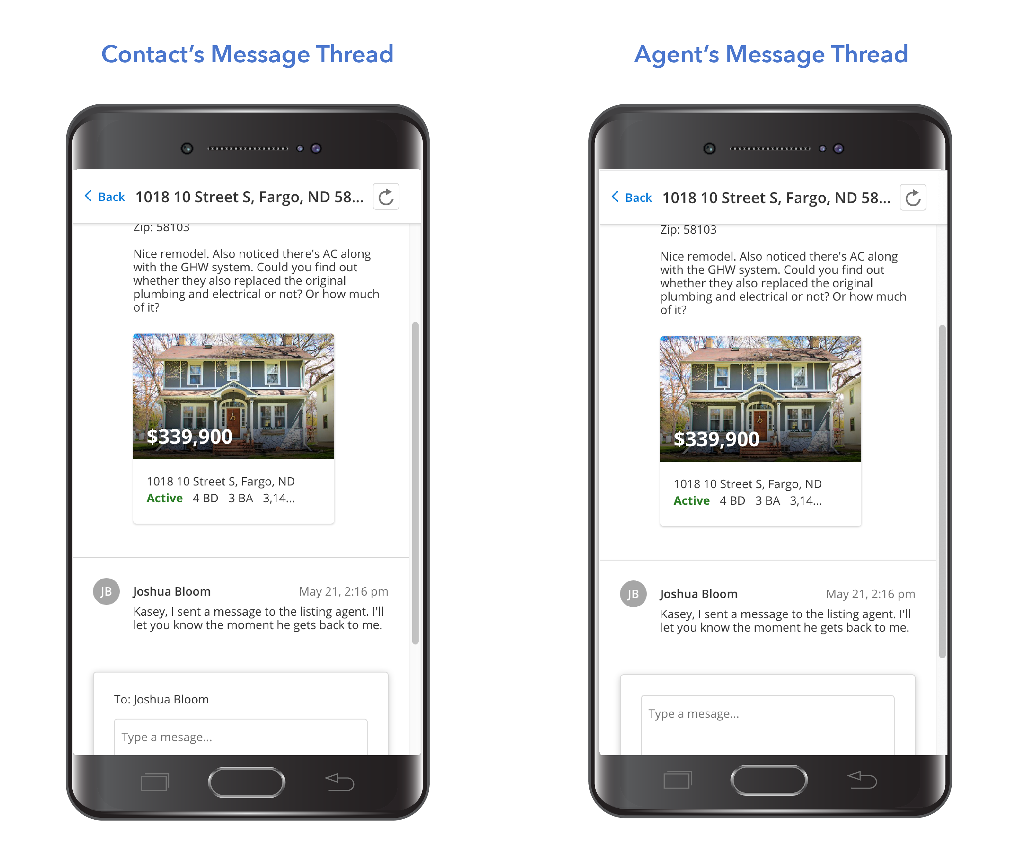 When a contact sends a message from a listing, a clickable summary of the listing information is always included, making it clear which property the conversation is about. Tapping the photo will take you directly to the detail view for the listing. From there, tapping Back returns you to the contactÕs message, making it easy to review a listing and then respond to a question.