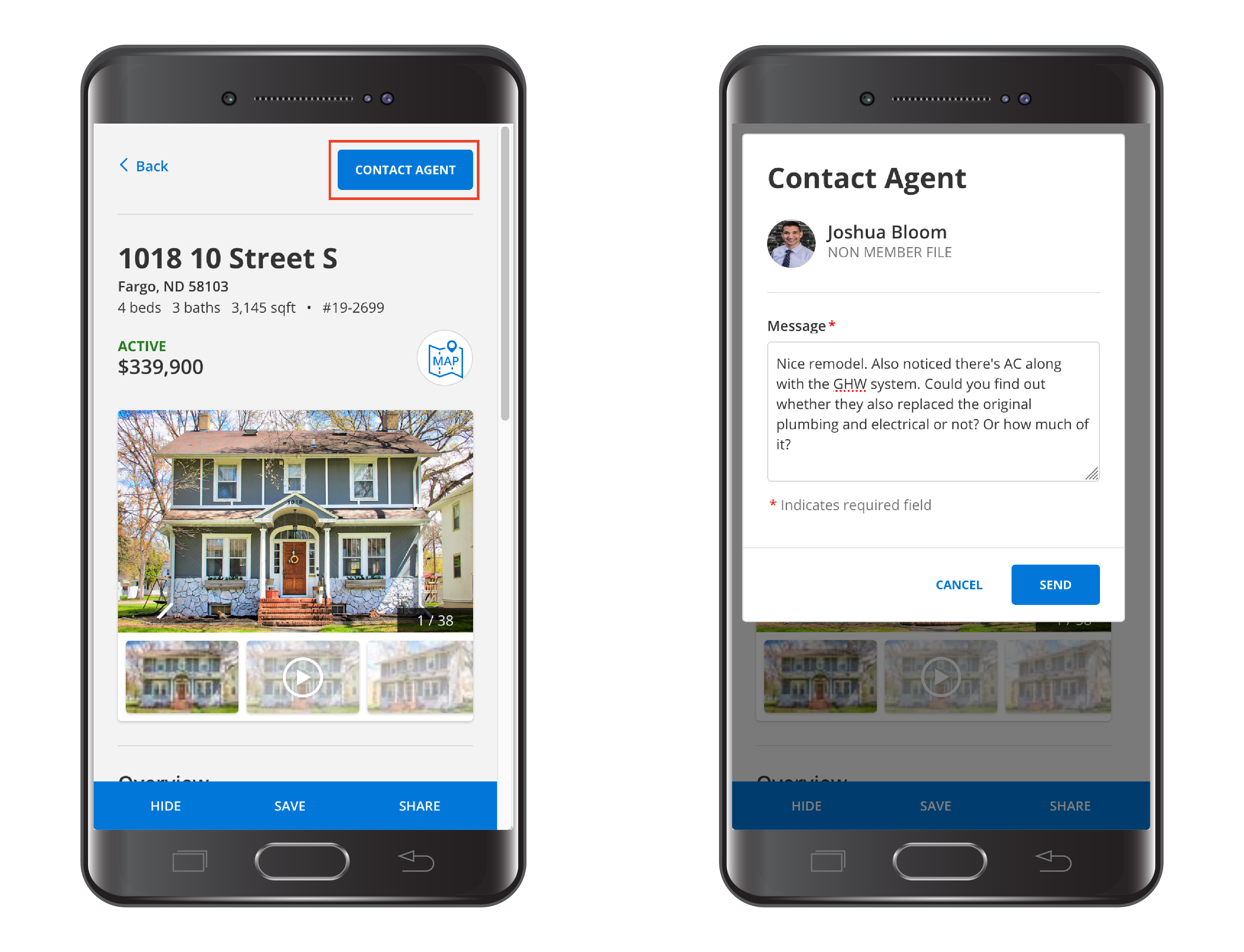 Your clients can quickly and easily ask a question, request a showing, or comment on a listing by tapping the Contact Agent button. Even if theyÕre not logged in, clients can send a message to their agent. (Logging in is required to see the agentÕs reply.)