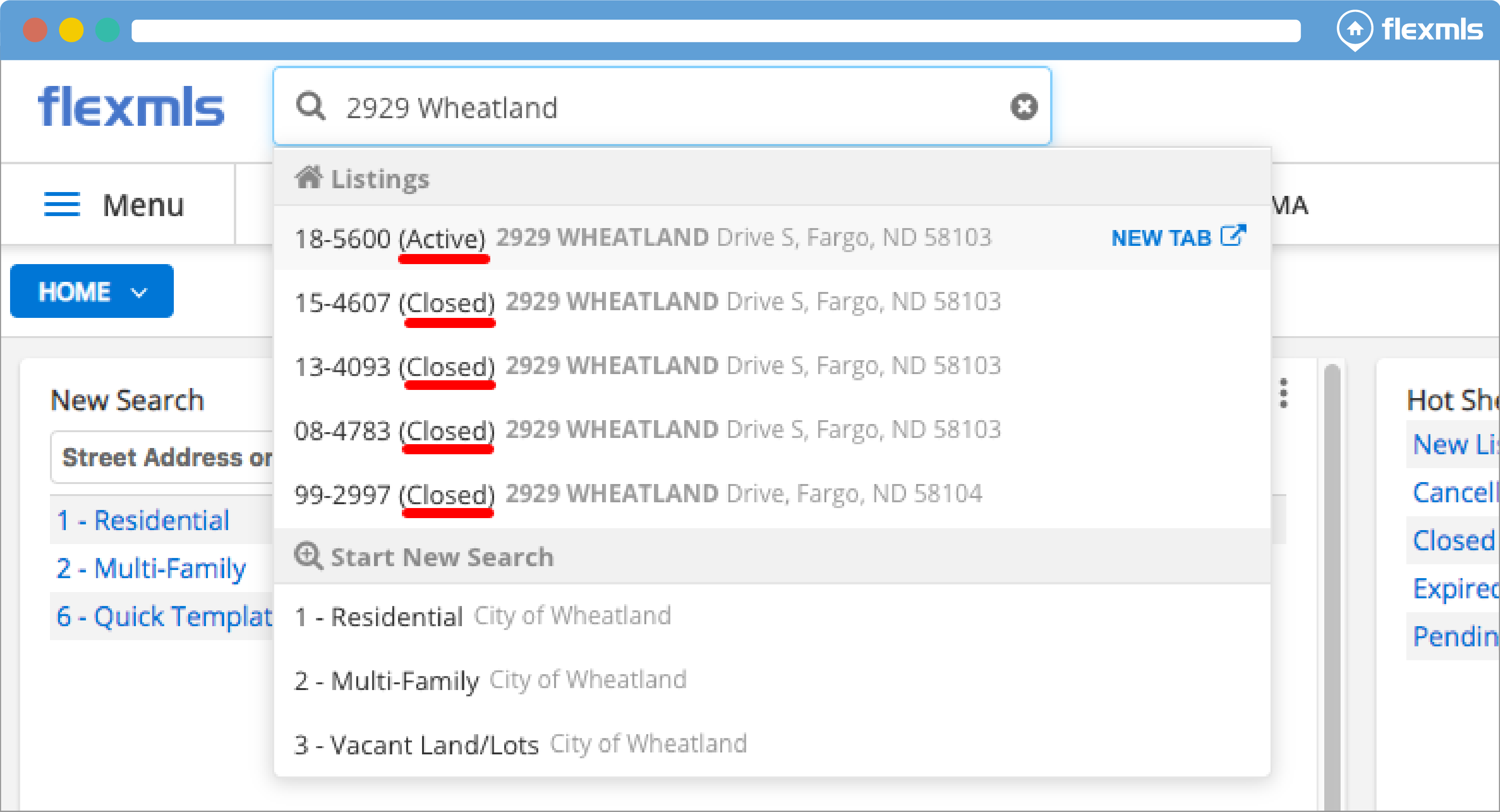The Quick Launch is a multipurpose search bar located at the top of most screens in Flexmls. You can use it to access recent searches, search various areas of Flexmls, and create basic listing searches. When you use the Quick Launch bar to search by address or MLS #, a listingÕs status will display.