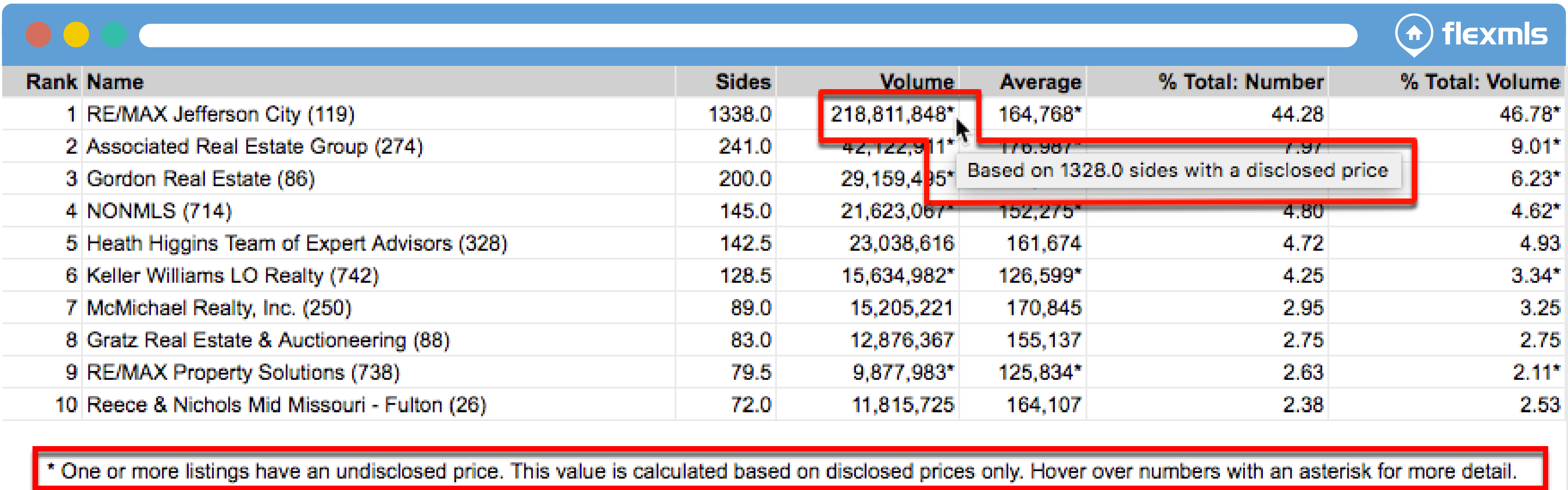 If a total in the Volume, Average, or % Total Volume column involves listings with non-disclosed sale prices, an asterisk will appear next to the number. A note at the bottom of the report lets you know: One or more listings have an undisclosed price. This value is calculated based on disclosed prices only. Use your mouse to hover over a value with an asterisk and a popup will indicate how many sides with a disclosed price were used to calculate the value.