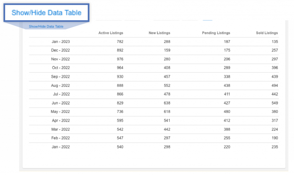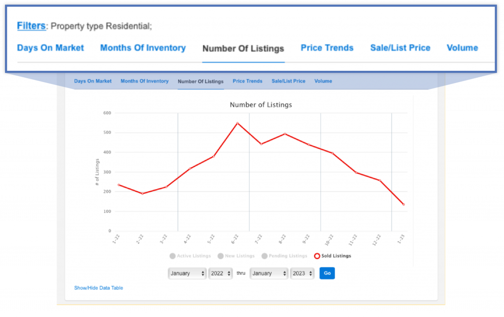 You are still able to filter your data by a Quick Search or a Saved Search. You can also filter your data by selecting or deselecting the circles in the legend at the bottom of the graph, if more than one option is present. A new tab style display easily shows different data sets (Days on Market, Months of Inventory, etcÉ), and the simplified single-axis style makes graphs easier and faster to interpret.