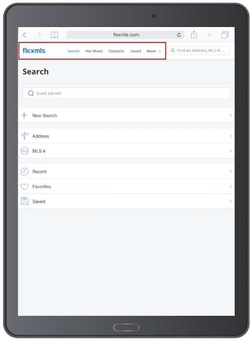 When using Flexmls Pro for Android or Mobile Web on a larger device, such as a tablet, the Menu icons will display as text rather than icons. The menu bar will display at the top of the screen and tapping the Flexmls logo allows you to return to the default search screen. An example of the Search screen appears below.