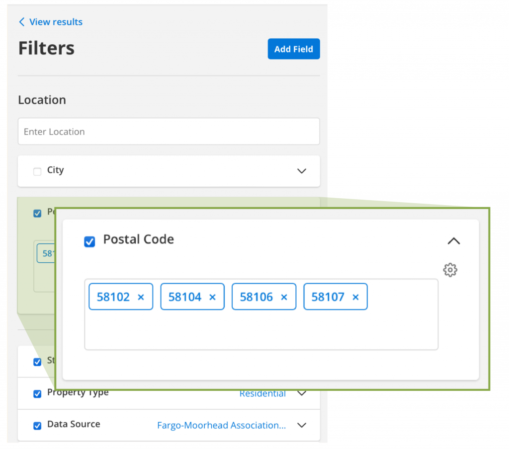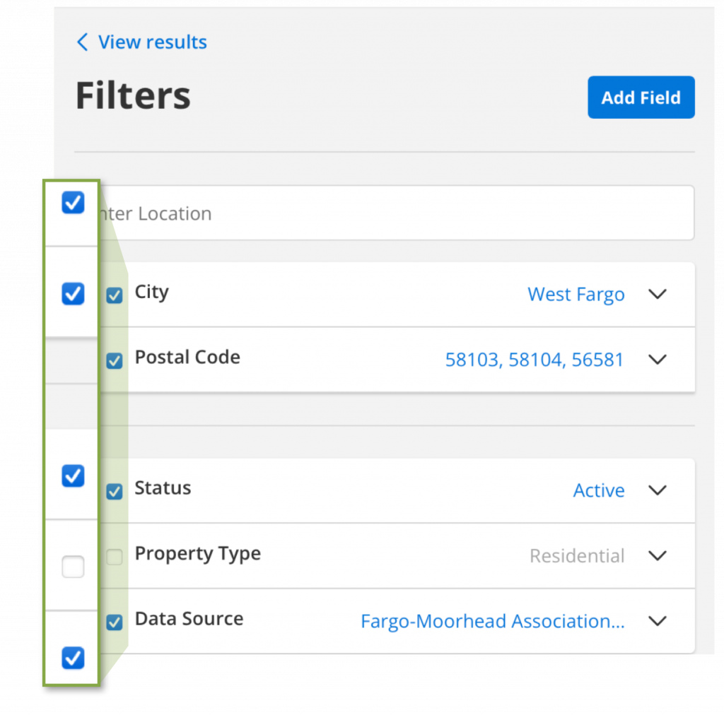 Filters are now organized into sections based on relevance (e.g. all location filters are grouped together). Use the checkboxes to modify your search using multiple filters at once. Unchecked boxes will not filter or affect search results. In this example Property Type of Residential is disabled and will not affect results.