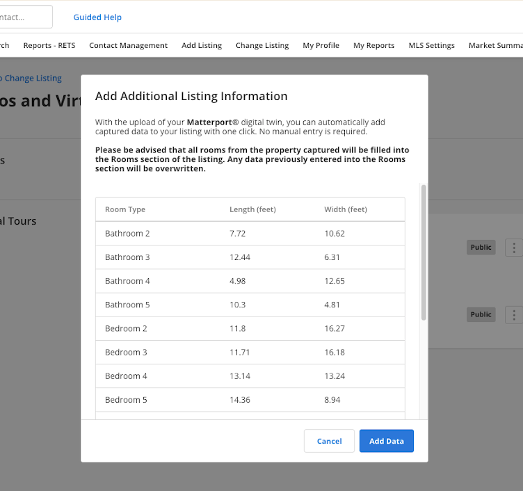 When you upload a Matterport or iGUIDE virtual tour, we give you the option to use that media data to auto-populate rooms information on your listing. We have made some updates to how that works, so that when you upload a Matterport or iGUIDE virtual tour, you will now see a preview of the Rooms data that was pulled from the virtual tour.