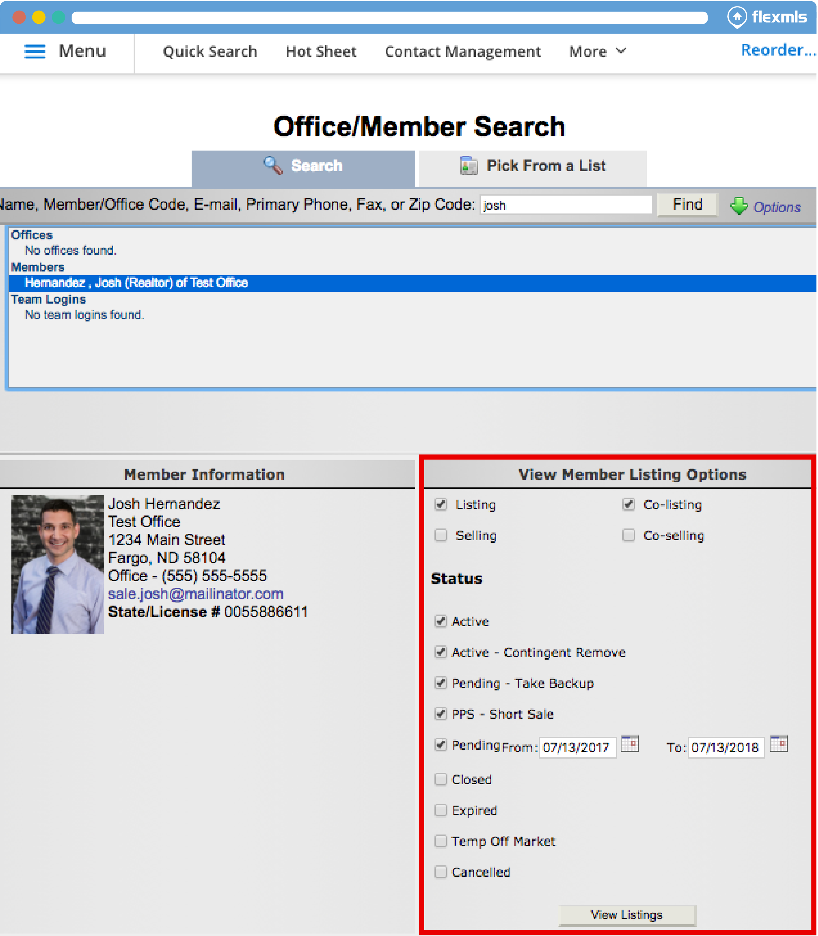 Starting on August 9th, when you view an office or member record on the Office/Member search screen, youÕll be able to select exactly which statuses and off market dates youÕd like to see when using the View Listings option (as allowed by your MLS). This will improve your ability to look up a member and quickly access their listings from the Office/Member search screen on Flexmls Web.